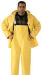 Includes Jacket, Detachable Hood, and Bib Overalls. Sizes M-8XL Jacket has a vented cape back, 5-snap storm flap front, two front pockets with flaps, wrists with snaps. Drawstring hood has four snaps and a chin strap. Overalls have adjustable elastic suspenders with triangular D-ring buckles and studs. Single snap fly.
