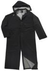 35mm flame resistant PVC on polyester with a detachable hood. Sizes: M-4XL. Vented cape back, snap front with storm flap. One outside and inside pocket, badge holder, and two inner leg snaps which form chaps.