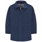Two-way, separating, heavy-duty Nomex®, taped brass zipper, fully covered with insulated storm flap, concealed snap closure › Fully insulated stand-up collar › Knit storm cuff with hook-and-loop suppression tabs › Three large patch pockets with concealed snaps (lower pocket with handwarmers) › One inside chest pocket › Sleeve pocket › Deep-pleated action back › Elastic inserts at waist across back › Internal snow belt. Fabric Shell: Westex Ultrasoft® Flame-resistant 7 oz.