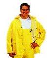 Includes Jacket, Detachable Hood, and Bib Overalls. Sizes M-8XL Jacket has a vented cape back, 5-snap storm flap front, two front pockets with flaps, wrists with snaps. Drawstring hood has four snaps and a chin strap. Overalls have adjustable elastic suspenders with triangular D-ring buckles and studs. Single snap fly.