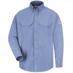 (LIGHT BLUE) Gusset side seam for ease of movement › Banded, topstitched, button down collar › Two chest pockets with button flap closures and sewn in pencil stall › Placket front with button closure › Tailored sleeve placket › Topstitched cuff › Straight back yoke. Fabric Flame-resistant, 7 oz. (235 g/m²), 48% Modacrylic / 37% Lyocell / 15% Aramid. Arc rating ATPV 9 calories/cm² (KH and LB). Arc rating ATPV 11 calories/cm² (NV).