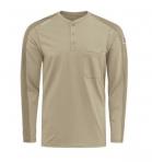 (KHAKI) Gusset side seam for ease of movement › Banded, topstitched, button down collar › Two chest pockets with button flap closures and sewn in pencil stall › Placket front with button closure › Tailored sleeve placket › Topstitched cuff › Straight back yoke. Fabric Flame-resistant, 7 oz. (235 g/m²), 48% Modacrylic / 37% Lyocell / 15% Aramid. Arc rating ATPV 9 calories/cm² (KH and LB). Arc rating ATPV 11 calories/cm² (NV).