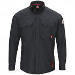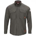 Banded, Topstitched collar with red trim at neck seam, Topstitched cuffs with two-button adjustable closures, Tailored sleeve placket, Hemmed front placket with button closure, Double needle topstitching, Larger Patch chest pockets, Full sideseam gusset. Bulwark Exclusive 5.5 oz. 50% Aramid 25% Lyocell 25% Modacrylic - Flame-resistant. Arc Rating ATPV 8.5 calories/cm².