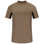 Self-fabric crew neck collar, Concealed chest pocket and pencil stall, Tagless, Raglan sleeves, Contrast mesh side seam gusset, Heat seal Bulwark® triangle centered at neck to show wearer has on FR undergarment. EXCEL FR® Flame-resistant, 5.5 oz. (185 m/g²) 90% Cotton / 10% Polyester with moisture management finish. Arc Rating ATPV 6.4 calories/cm².