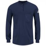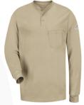 Fabric Excel FR® Flame-resistant, 7.25 oz. (245 g/m²) Interlock FR 100% Cotton-Sizes S-XL. Three button placket, Knit henley collar, Rib-knit cuff, Single spade chest pocket. Care Home Wash