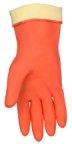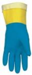 This flock-lined neoprene on latex glove has a 28 mil thickness on the blue area and a diamond embossed grip on palm and fingers. The component materials comply with FDA regulations for food contact. Applications include- aircraft assembly, automotive, battery manufacturing and the printing industry. Sold per dozen pair.