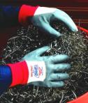 Nitrile Coated Gloves. Durable nitrile coating is your best bet when handling rough castings, cores, extrusions, tubular steel, sheet metal, lumber, drywall, concrete blocks and tile. Protects against cuts, snags, punctures and abrasion; resists oil and grease. Replaces medium-to-heavy duty leather palm work gloves. Rough finish for sure wet grip and extra wear. Smooth finish for good dry grip and more flexibility. Sanitized to reduce bacterial growth. Complies with 21 CFR standards.