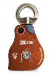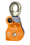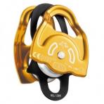 Knot-passing pulley. Voluminous rope channel allows the passage of joining knots (lifting loads over great distances or moving along a Tyrolean traverse with two ropes). Large diameter sheave ensures excellent efficiency. Locking pins on the sheave allow use of the pulley as an anchor.