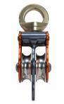 The larger sized Prusik-minding pulley (PMP) Swivel 2.6 is ideal for industrial rescue use where maximum pulley efficiency and strength is important. The rotating swivel aligns the rope with the direction of the pull. By combining the swivel with the pulley, overall system length is minimized, increasing travel. The patented pivoting side plate allows the rope to be quickly inserted. Prusik-minding side plate opens without having to disconnect the pulley from the anchor.