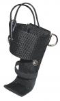 The 5487RC universal radio holder mates with the radio strap with D-rings. The radio is held securely on a shelf like bottom by an elastic strap. A velcro secured ballistic weave strap closes around the radio, and there are two stretch cords over the top that snap to the holder. A belt loop also allows for placement on a waist belt.