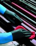 Neoprene over natural rubber latex gloves allow good fingertip sensitivity. Neoprene over natural rubber latex provides excellent resistance to many chemicals. 100% cotton flock lining ensures cool comfort. Self-flushing tractor-tread grip encourages fluid run-off. Black, over blue safety feature shows wear areas. Ideal for automotive, chemical, aircraft, food, pesticide and printing applications.