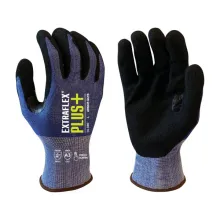 18 Gauge, ExtraFlex Plus® Dark Blue Engineered Liner With Black HCT® Micro Foam Nitrile Palm Coating, Thumb Crotch Reinforcement, Touchscreen compatible, ANSI 3, the MicroFoam coating ensures excellent oil grip. Can be used in Automotive, Manufacturing, Light Manufacturing, Sheet Metal Handling, Metal Stamping, and Construction applications