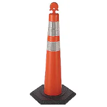 EZ-GRAB Trim Line Channelizer - 42” low density polyethylene material is durable and impact resistant. Patented, reinforced EZ-Grip handle allows for ease of movement and placement. Stackable for storage and transport requires less space than standard traffic control barrels. Will accept standard barricade lights. Meets MUTCD standards and is certified crashworthy to NCHRP-350. Recycled rubber bases available in 16lb., 25lb. and 30lb weights.