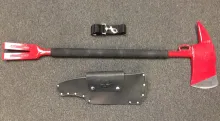 The ALL-AXX is an 11 pound steel handled axe with a 6 lb. pickhead on one end and a halligan fork on the other. Designed for the roof, the 6 lb. blade can make a crevice so the fork can fit in the bulkhead door. The spike can be used as a handle to pry open the crevice or it can pull the roof open after cutting it with a saw. The top of the axe is a striking plate so you can drive the fork into the crevice if necessary.