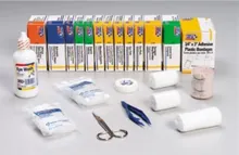 Refill Kit Includes: (100) 3/4" x 3" Adhesive Plastic Bandages, (3) 2" x 2" Gauze Dressing Pads (2/Pkg), (1) 5" x 9" Trauma Pad, (2) 2" Conforming Gauze Roll Bandages, (1) 3" Conforming Gauze Roll Bandage, (1) 36" Triangular Sling/Bandage w/ 2 Safety Pins, (10) Aspirin Tablets (2/Pkg), (18) BZK Antiseptic Cleansing Wipes, Sting-Free, (10) Triple Antibiotic Ointment Packs, (10) Insect Sting Relief Pads, (1) 2" x 5 yd Latex-Free Elastic Bandage,