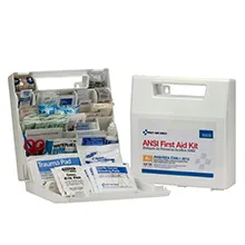 Plastic, organized case comes with a carrying handle and is wall mountable. Contents meet the 2015 ANSI Class A requirements and are sufficient to treat 25 or more people.