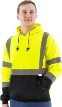 Sweatshirt with hood, high visibility yellow and black. Pullover Ribbed cuffs/waist