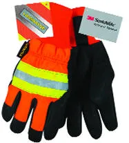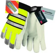 This premium grade goatskin glove features a keystone thumb, 3M Scotchlite reflective material on knuckle, wrist and three fingertips, a lime fluorescent polyester back, a Thinsulate™ full sock lining and a velcro wrist closure. industry applications include lawn and tree service, mining and road construction.