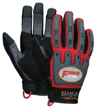 Ergonomically designed rough textured palm pad to enhance grip in dry applications and TPR padding on the back of hand and fingers for full dorsal metacarpal protection. Clarino® synthetic leather base palm with a breathable / expandable fourchettes and mesh fabric back combine for personal fit and comfort. Extra tacky fingertips enhance grip and provide longer wear. Micro terrycloth perspiration wipe on back of thumb. Adjustable wrist closure with red nylon pull tab.