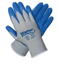 "MEMPHIS FLEX" SEAMLESS NYLON KNIT GLOVE. GRAY NYLON SHELL, BLUE FOAM LATEX DIPPED PALM AND FINGER.
