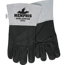 This premium grade black grain pigskin full leather back glove features a full sock lining and a wing thumb and a 4 1/2” gray split cowhide gauntlet cuff. Sewn with Kevlar thread to resist sparks and sharp metals which can unravel most gloves. This glove is great for Low Heat Protection, Metal fabrication, Ship building, and Mig/Tig welding.