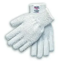 This cut- resistant, reversible regular weight glove is made with dual stainless steel, wrapped with soft polyester yarn for strength and a comfortable fit . The 9381 and 9382 feature PVC blocks on one or two sides. The component materials comply with FDA regulations for food contact. Launderable, individually packaged and color-coded on the hem to identify sizes, this glove can be used for canning, food processing, glass handling and metal fabricating.