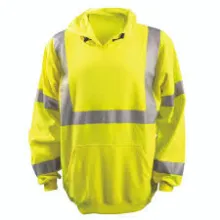 Class 3-Type R Hi-Vis Yellow Pullover Hoodie. 2” 3M™ Scotchlite™ Reflective Material: One 360 Horizontal stripe, two vertical and two sleeve stripes. Draw Cord Hood. Pockets: 1 Pouch, 100% ANSI Modacrylic/Poly/Cotton Fleece Blend 14.25 oz. Flame Resistant Thread. Classified by UL to NFPA 2112-2018, CAT 3 Protection- ATPV 28 Cal/Cm², ASTM F1506, NFPA 70E, NFPA 2112-2024