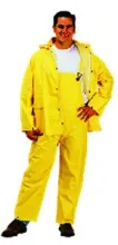This rainsuit features a corduroy collar for comfort, a cape back with nylon vents for breathability, underarm vents, a zipper front for extra protection, two front flap pockets for storage and convenience, adjustable suspender clips for easy fastening, heat welded stitches for tear resistance, adjustable ankle straps and cuff snaps for a better fit and heavy PVC reinforced joints for durability. The jacket has a detachable hood. Available in sizes S thru 5XL