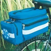 The AED pannier has a pocket measuring 14"H x 34" in circumference which is sufficient room for practically any AED on the market. Four clear vinyl pockets on the flap for miscellaneous supplies. This is a right side pannier because most bikes would fall to the left of be laid down on the left, thus protecting the AED.