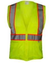 ANSI 107 Type R, Class 2 Compliant. Our Hi-Vis Safety Economy Vest features lightweight and comfortable mesh fabric, 2 inside pockets, 1 external pocket, and 1 cell phone pocket. 2" Retroreflective Tape with 360 Degree Reflective Coverage. High Visibility Lime - a.k.a. Fluorescent Yellow-Green. Contrasting Hi-Vis Orange Trim. Silver Fabric Reflective Material. 100% Woven Polyester Mesh.