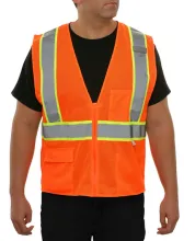 ANSI 107 Type R, Class 2 Compliant. Our Hi-Vis Safety Economy Vest features lightweight and comfortable mesh fabric, 2 inside pockets, 1 external pocket, and 1 cell phone pocket. 2" Retroreflective Tape with 360 Degree Reflective Coverage. High Visibility Orange. Contrasting Hi-Vis Lime a.k.a. Fluorescent Yellow-Green Trim. Silver Fabric Reflective Material. 100% Woven Polyester Mesh.