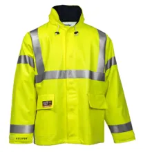 The Eclipse™ Offers Quad-Hazard™ High Visibility, Liquid Proof, Arc Flash And Flash Fire Protection. Patent Pending Thermo-Grid™ technology helps block out heat energy while the flame resistant PVC coating on Nomex® provides 100% liquid proof protection in a soft, lightweight suit. ANSI/ISEA 107 Class 3 compliant suit, jacket and coat for flame resistance and high visibility. Conforms to ASTM F1891 for Arc Thermal Performance and NFPA 70E - HRC 2.