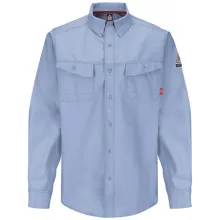 (LIGHT BLUE) Topstitched collar with red trim at neck seam › Topstitched cuffs with two-button adjustable closures › Hemmed front placket with button closure › Patch chest pockets with reinforcement› Gas monitor pocket at front shoulders › Full side seam gusset. Fabric Exclusively with Westex G2™ fabrics by Milliken® - Flame-resistant, 6.9 oz. (235g/m2) Ripstop Twill, 65% Cotton / 35% Polyester. Arc Rating ATPV 9.0 calories/cm².
