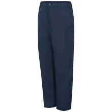 Contoured waistband. Pleated, Articulated knee. Triple-felled seams. Bottom of pant leg has hook-and-loop ankle straps to tighten around work boot. Pockets include two front slash pockets, two back welt pockets, and two deep, pleated cargo pockets with hook-and-loop closures.