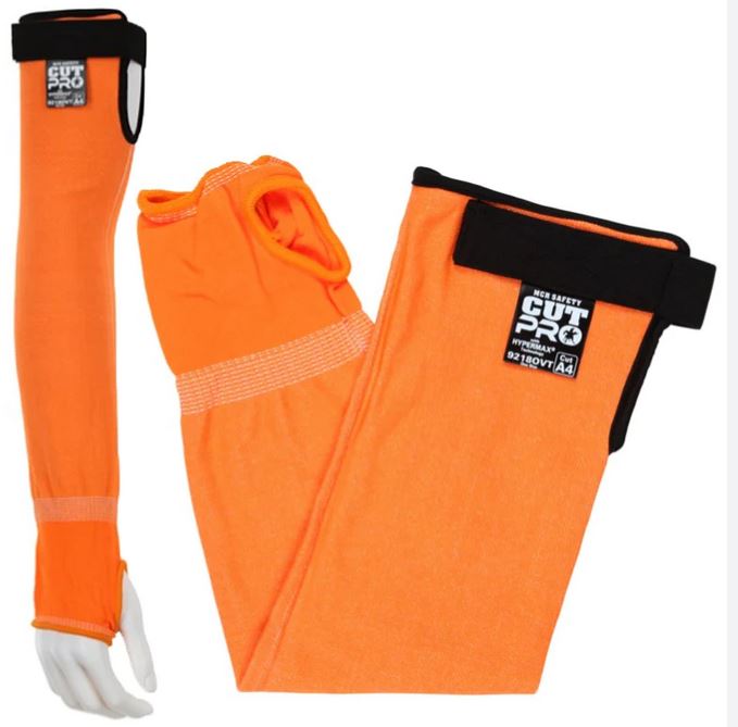 The 9218OVT Cut Pro® cut resistant arm sleeve features hi-visibility cut protection made with our soft and comfortable HyperMax™ fiber. This 18 inch sleeve features a 13 gauge knitting pattern which allows for excellent breathability and coolness on hot summer days or environments. The bicep portion of the sleeve features a unique reinforced hook and loop sleeve band that will easily adjust for a personal fit. Upper and lower sleeve cuffs and thumb slot are hemmed for extended durability. Be safe with MCR Safety Cut Pro® sleeves.
