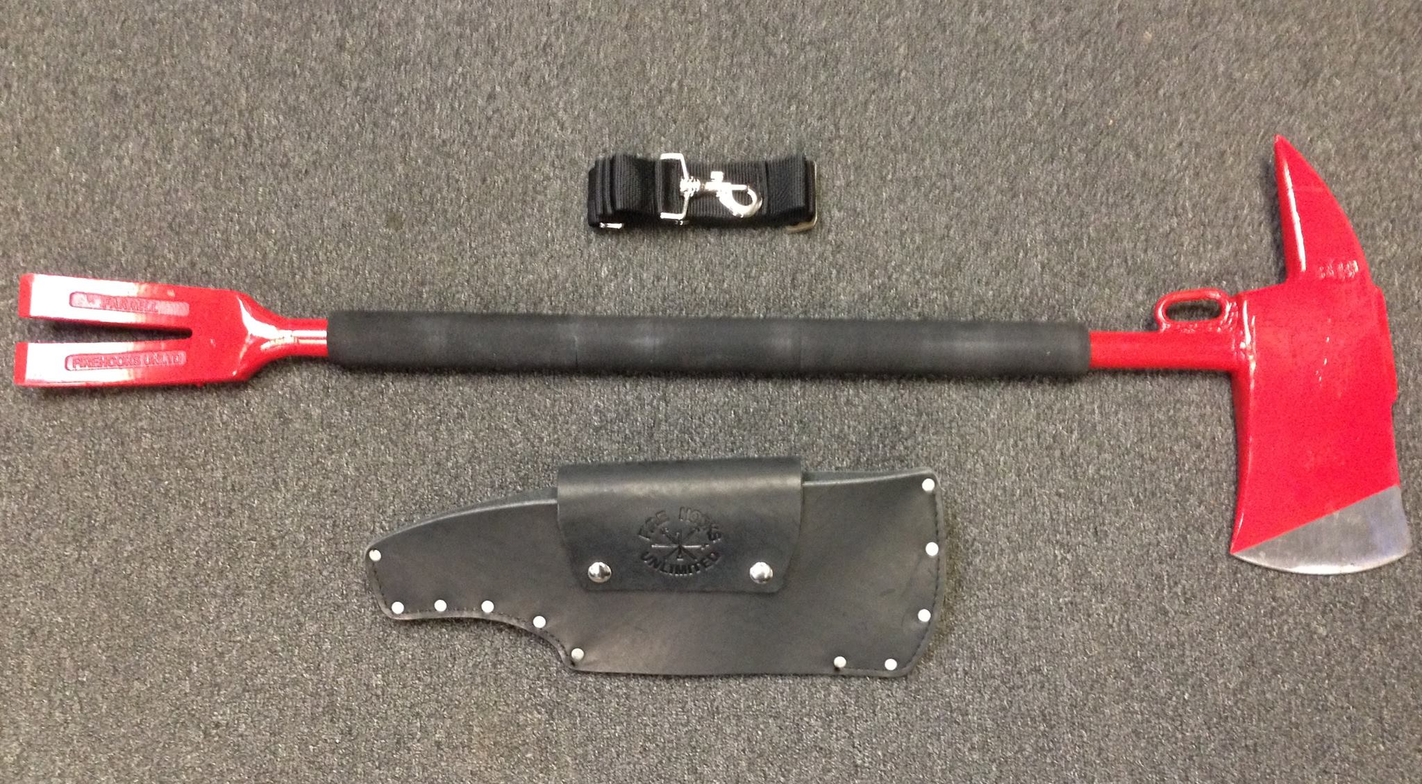 The ALL-AXX is an 11 pound steel handled axe with a 6 lb. pickhead on one end and a halligan fork on the other. Designed for the roof, the 6 lb. blade can make a crevice so the fork can fit in the bulkhead door. The spike can be used as a handle to pry open the crevice or it can pull the roof open after cutting it with a saw. The top of the axe is a striking plate so you can drive the fork into the crevice if necessary. The ring can be used to rope vent windows with a half hitch on the handle. The axe can be hip carried with a carabiner or by using a sheath with shoulder strap. It can be ordered alone or as a set (pictured).
