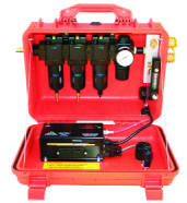 These portable Grade-D filtration systems are designed to provide breathing air for a specific number of workers. the system filters inlet air to provider respirator users with Grade-D quality air and monitors for CO and/or Oxygen. The first stage element filters bulk water and particulates and has an auto drain. the second stage coalescing filter eliminates atomized oils, mists, ultra-fine particulates and has an auto drain as well. The third stage filter removes organic vapors and odors and has a manual drain. Filter change indicators are standard on all three stages of filtration. filtration efficiency is 99.99% @ .01 micron. all Breather Boxes are designed to be used in the upright and closed positions. The standard carbon monoxide airline monitor operated on disposable 9-volt batteries, 12-volt DC line voltage, or 115 VAC for continuous air monitoring. an external alarm and light signals the workers of high CO content. Remote alarms are available for portable and fixed applications.