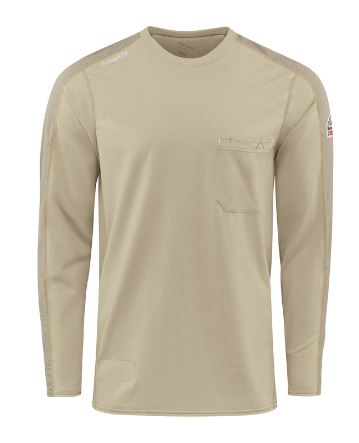 Bulwark FR Men's Flex Knit tee gives you the stretch of your favorite T-shirt while keeping you cool and dry. The lightweight fabric flexes for added comfort and range of movement, curved flatlock seams for optimal fit, unique front pocket design with pencil stall. CAT 2/2112 left sleeve label leaves no question you’re protected on the job site.
