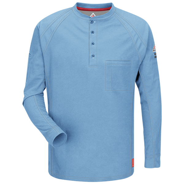 (BLUE) Four-button placket › Dyed to match rib knit henley collar › Raglan sleeves › Dyed to match concealed rib knit cuffs › Chest pocket › Fabric is moisture wicking and breathable › iQ reseller hang tag. Fabric Exclusively with Westex G2™ fabrics by Milliken® - Flame-resistant, 5.3 oz. (180 g/m2) 69% Cotton / 25% Polyester / 6% Polyoxadiazole. Arc Rating ATPV 8.2 calories/cm².