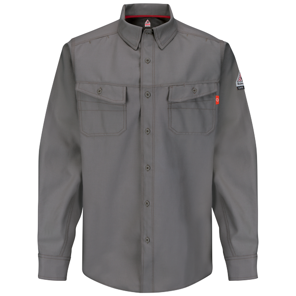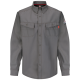 (GREY) Topstitched collar with red trim at neck seam › Topstitched cuffs with two-button adjustable closures › Hemmed front placket with button closure › Patch chest pockets with reinforcement› Gas monitor pocket at front shoulders › Full side seam gusset. Fabric Exclusively with Westex G2™ fabrics by Milliken® - Flame-resistant, 6.9 oz. (235g/m2) Ripstop Twill, 65% Cotton / 35% Polyester. Arc Rating ATPV 9.0 calories/cm².