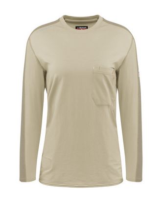 Bulwark FR Women's Flex Knit tee gives you the stretch of your favorite T-shirt while keeping you cool and dry. The lightweight fabric flexes for added comfort and range of movement, curved flatlock seams for optimal fit, unique front pocket design with pencil stall. CAT 2/2112 left sleeve label leaves no question you’re protected on the job site.