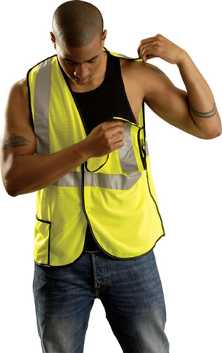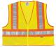 Class 2, Breakaway Mesh Vest. 2” 3M™ Scotchlite™ Reflective Material: One 360° horizontal stripe, two vertical stripes. 100% ANSI Polyester Mesh. Pockets: 1 outside lower, 1 inside chest w/ hook & loop. Hook & loop closure