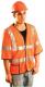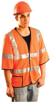 One outside pocket. Reflective striping compliant with ANSI Class 3 configuration