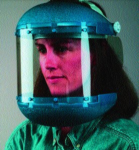 Molded plastic headgear and chin-guard provides greater protection from splashes, dust and other contaminants. Ratchet headgear allows for maximum comfort with simple turn of the knob for adjustment. Other features include: high impact spark guard, easy keyhole window mounting and anti-warp design. A 7" X 19" clear .040 window is included. Complies with ANSI Z87.1-1989 Standards. Sold individually.