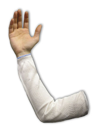 100% Dyneema sleeves, white. Dyneema® is a brand of polyethylene fibers that are 10 to 15 times stronger than steel, more durable than polyester and a strength that is 40% greater than Aramid fiber. Washable. Seamless construction. Color coded hems for easy size identification. Suitable for food contact. Offers arm cut protection for applications that require large object