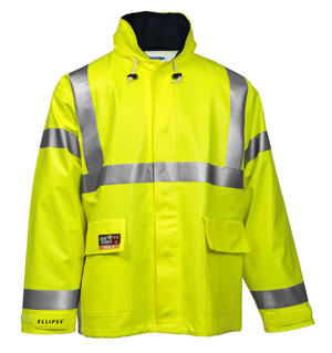 The Eclipse™ Offers Quad-Hazard™ High Visibility, Liquid Proof, Arc Flash And Flash Fire Protection. Patent Pending Thermo-Grid™ technology helps block out heat energy while the flame resistant PVC coating on Nomex® provides 100% liquid proof protection in a soft, lightweight suit. ANSI/ISEA 107 Class 3 compliant suit, jacket and coat for flame resistance and high visibility. Conforms to ASTM F1891 for Arc Thermal Performance and NFPA 70E - HRC 2. Jacket and overall styles conform to ASTM F2733 for Flash Fire Performance. Fluorescent background colors for excellent daytime visibility. 2" silver reflective tape reflects light for 360° nighttime conspicuity. Ideal Applications: All Electric and Gas Utilities, Power Generation, Pipeline and Construction work, and Petrochemical applications. FEATURES & BENEFITS