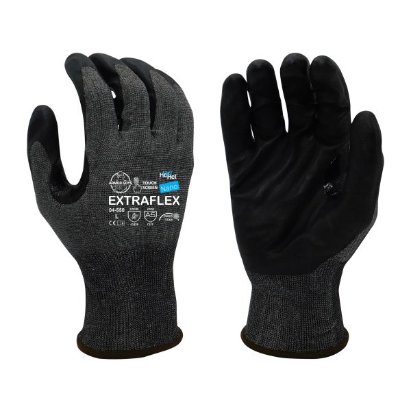 18g ExtraFlex® Cut Resistant Black Engineered Liner With Dark Gray HCT® Nano-Foam Nitrile Palm Coating And Nitrile Reinforced Thumb Crotch, ANSI A5, the Nano-Foam coating provides unparalleled dexterity & tactile sensitivity, and provides an excellent dry grip. Can be used in Automotive Manufacturing, Sheet Metal Handling, Construction, Metal Stamping, and Glass Handling applications.
