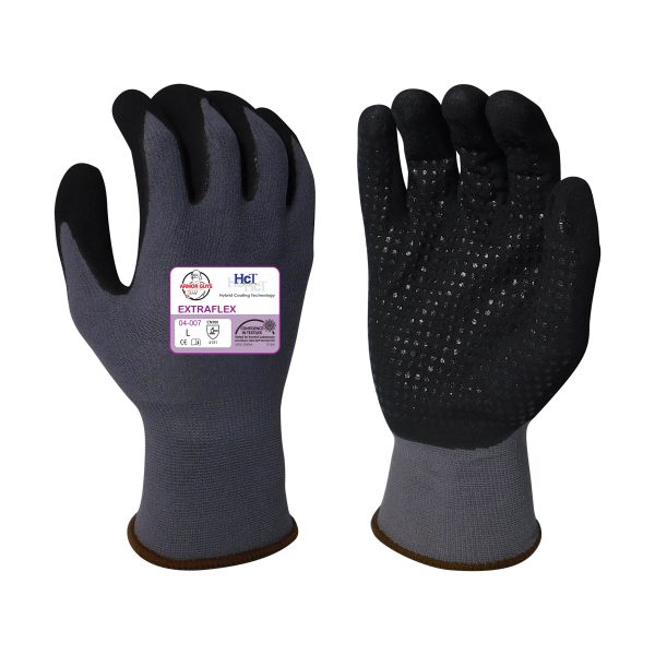 15g ExtraFlex® Gray Nylon Liner With Black HCT® Micro Foam Nitrile Palm Coating With Dots, provides enhanced grip & abrasion resistance, and has a breathable coating for superior comfort. Can be used in General Assembly, Automotive Assembly, Light Manufacturing, Maintenance, Warehousing, and Landscaping applications