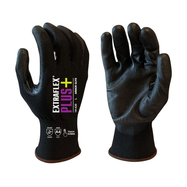 18 Gauge, ExtraFlex Plus® Black Engineered Liner With Black Polyurethane Palm Coating, Thumb crotch Reinforcement, Touchscreen compatible, ANSI 4. Can be used in Automotive Manufacturing, Metal Stamping, Construction, Sheet Metal Handling, and Steel Processing applications