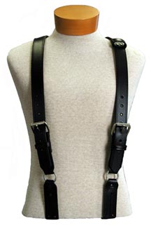 Boston Leather's new suspenders for firemans' turnout gear. Two 1-1/2" adjustable straps with roller buckles sewn and riveted for proven durability. A heavy duty elastic strap is also sewn in the back to allow a flex in the suspenders for a comfortable fit.